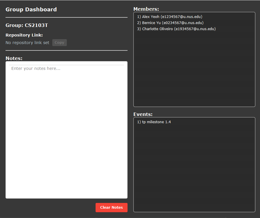 | Set repository link for a group | set-repo GROUP_INDEX r/REPOSITORY_LINK e.g., set-repo 2 r/https://github.com/AY2526S1-CS2103T-F12-1/tp |